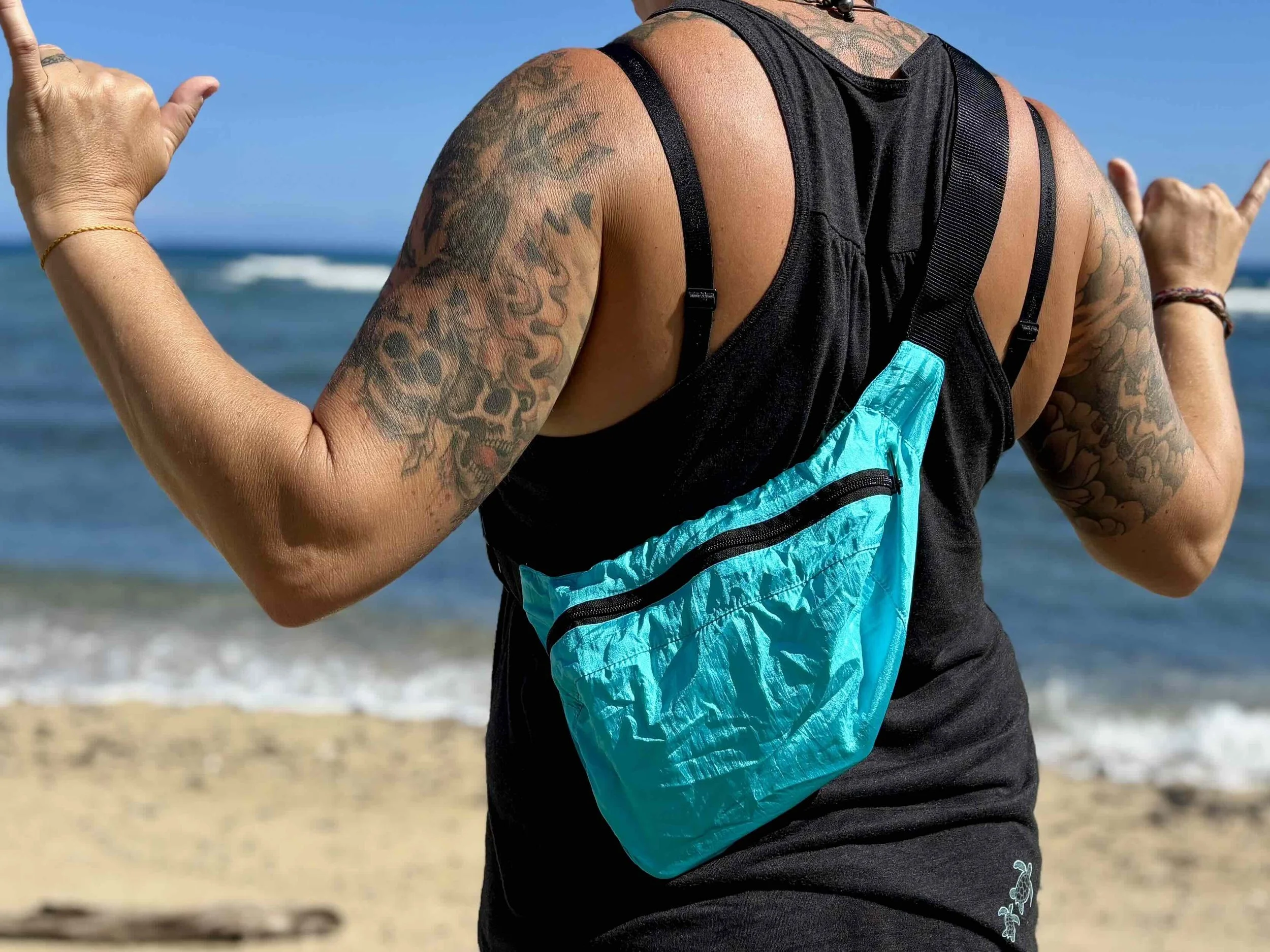 Made from Parachute Silk. XL Drink Holders + Adjustable Straps + Stuff Sack Attached that is large enough to hold your phone, wallet & keys. (2) YKK, Zippers that won’t rust or corrode. A perfect travel backpack made for the salty air.